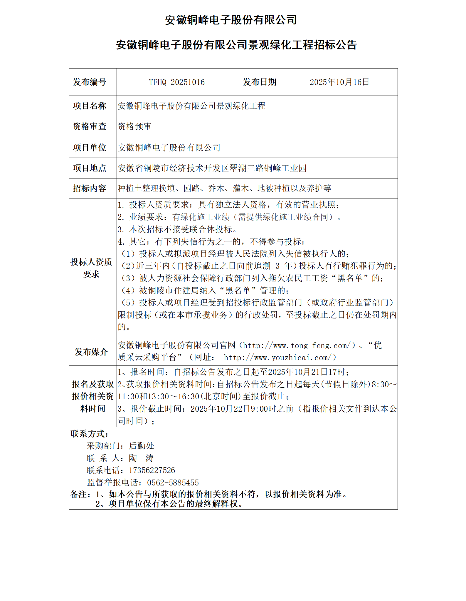 安徽銅峰電子股份有限公司 (安徽銅峰電子股份有限公司景觀綠化工程 招標(biāo)公告)_01